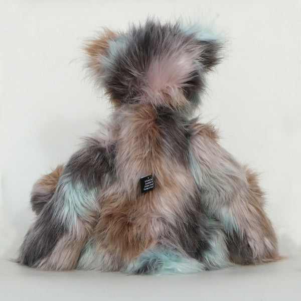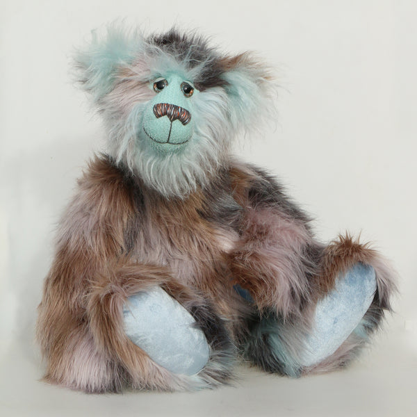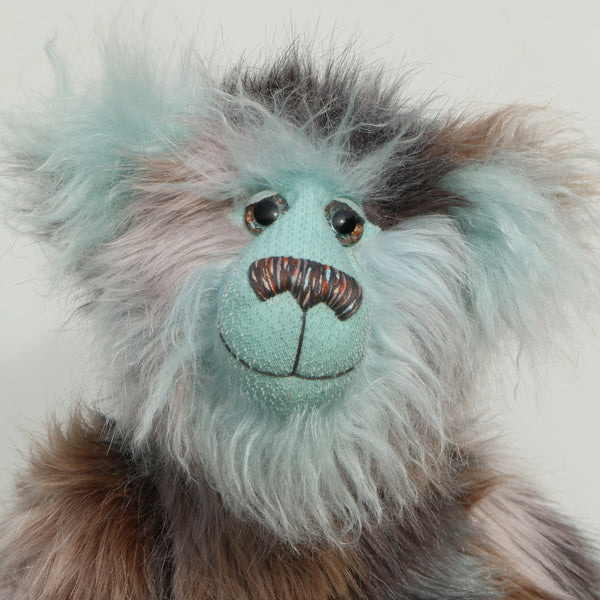 Clarence Cuddlemore is made from the most gorgeous and luxurious fabrics, mainly a very long, soft, faux fur which is a subtle blend of silver, charcoal and a dull brown, there are also patches of pale, sky blue which match the mohair of his face, the fronts of his ears and the underside of his tail. These are all a very long and fluffy sky blue mohair which gives him a very long and fluffy beard which you might find hard to resist stroking or twirling through your fingers. Clarence has glossy sky blue velvet paw pads that complement his mohair perfectly.