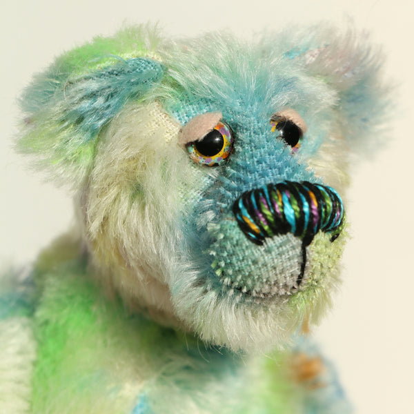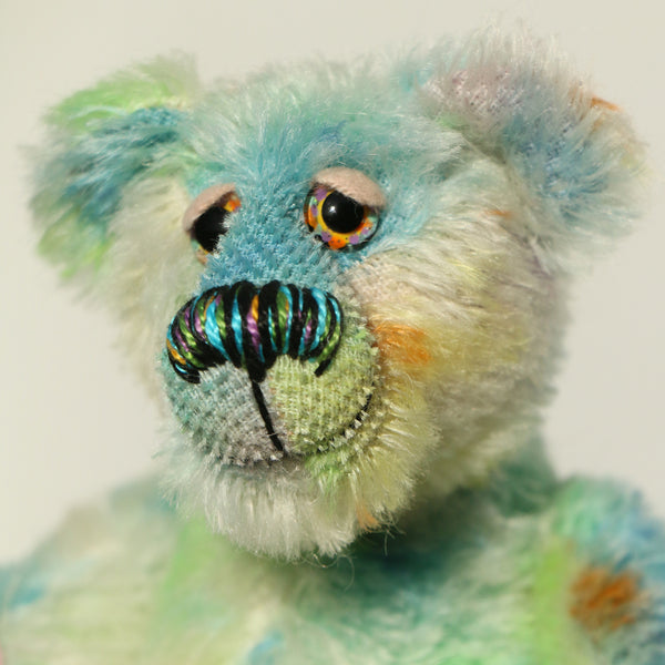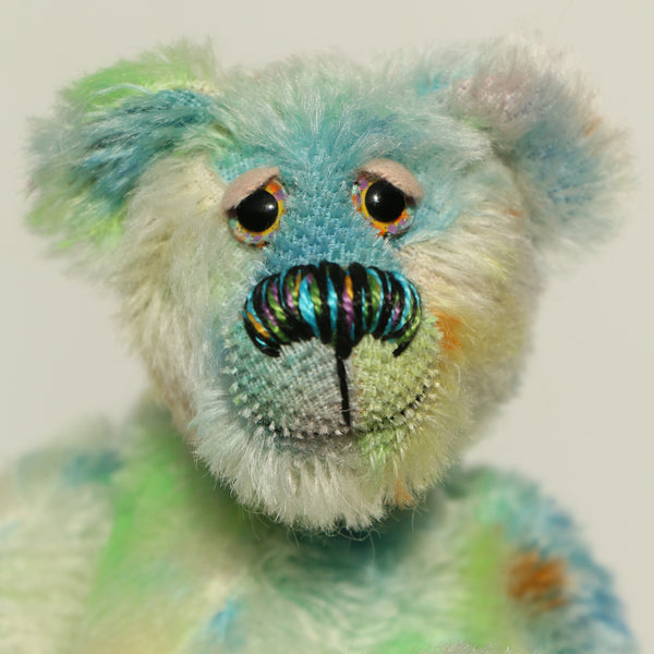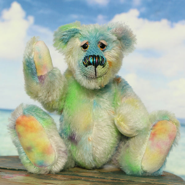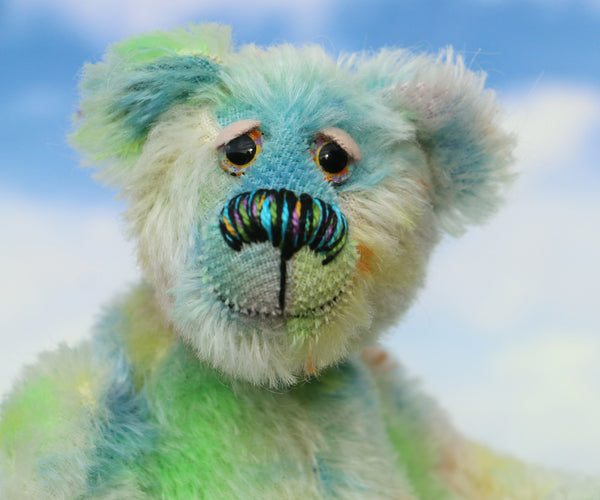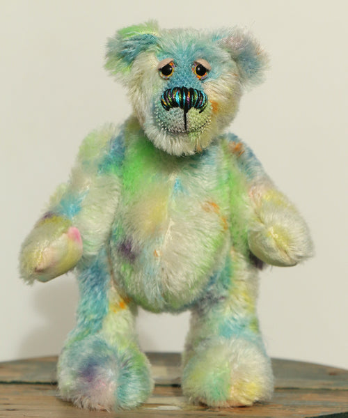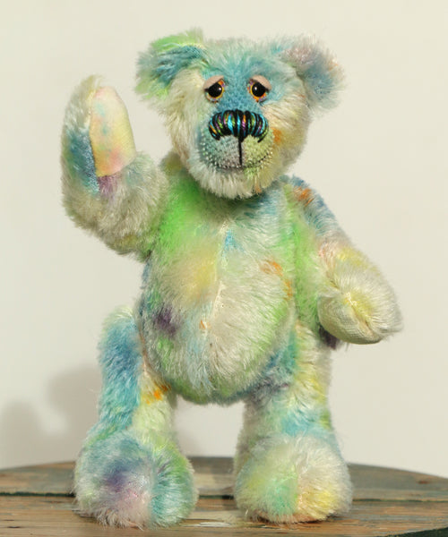 Colin Cockles is a very happy and colourful little teddy bear, a one of a kind, hand dyed mohair artist bear by Barbara-Ann Bears