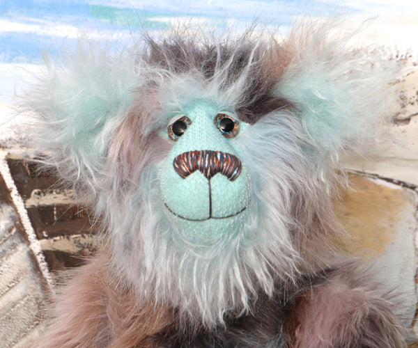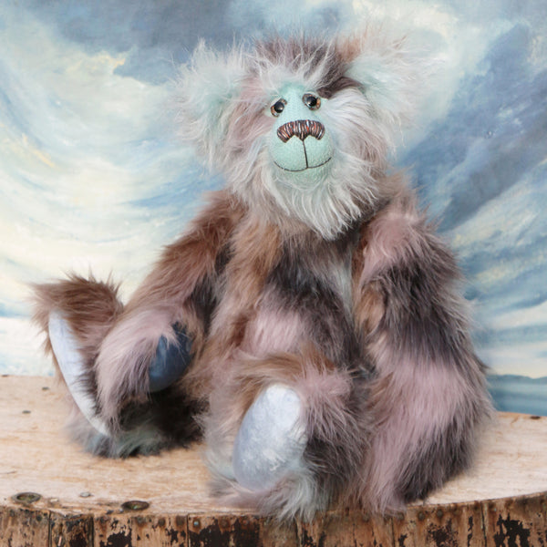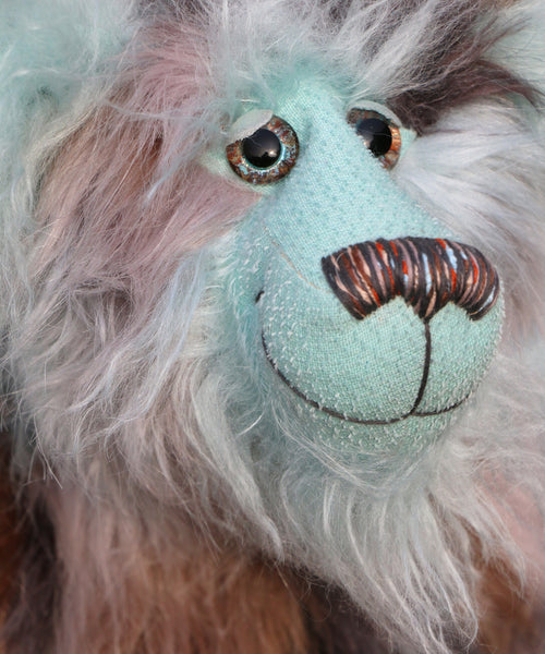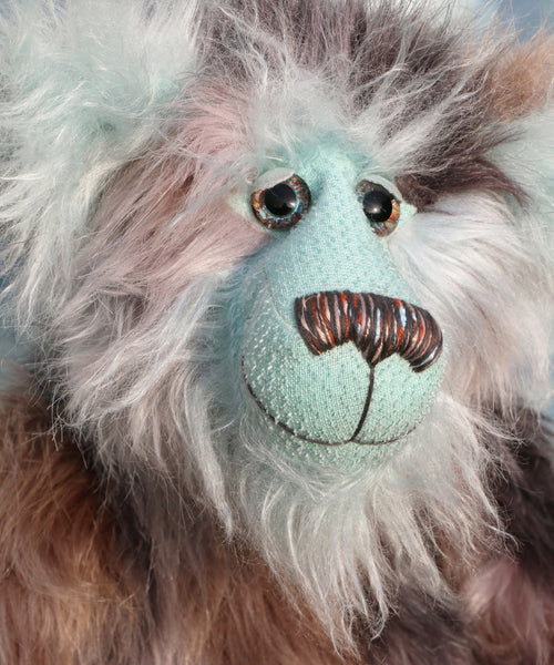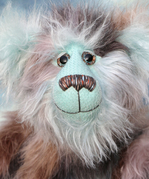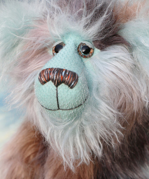 Clarence Cuddlemore is made from the most gorgeous and luxurious fabrics, mainly a very long, soft, faux fur which is a subtle blend of silver, charcoal and a dull brown, there are also patches of pale, sky blue which match the mohair of his face, the fronts of his ears and the underside of his tail. These are all a very long and fluffy sky blue mohair which gives him a very long and fluffy beard which you might find hard to resist stroking or twirling through your fingers. Clarence has glossy sky blue velvet paw pads that complement his mohair perfectly.