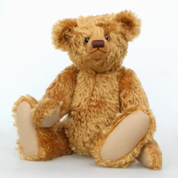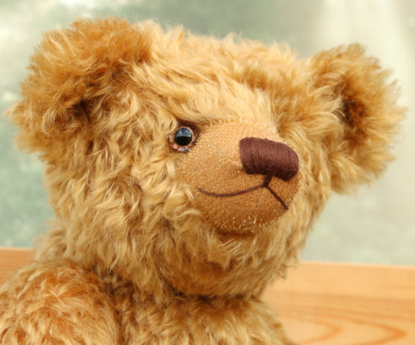 Cuthbert is made from the most gorgeous dense and wavy, fawn English mohair, like the colour of a young deer. It's a very beautiful and luxurious mohair that we were lucky to obtain for an elderly retiring teddy bear maker. His beige wool felt paw pads complement his mohair perfectly. He has has large black glass eyes, an impressive, carefully embroidered brown nose and the sweetest smile. Cuthbert has plastic pellets in his tummy, arms and feet which makes him more pose-able and flexible, allowing him to sit comfortably and to mould to your body if you pick him up and give him a hug...he's a bear you can hug.